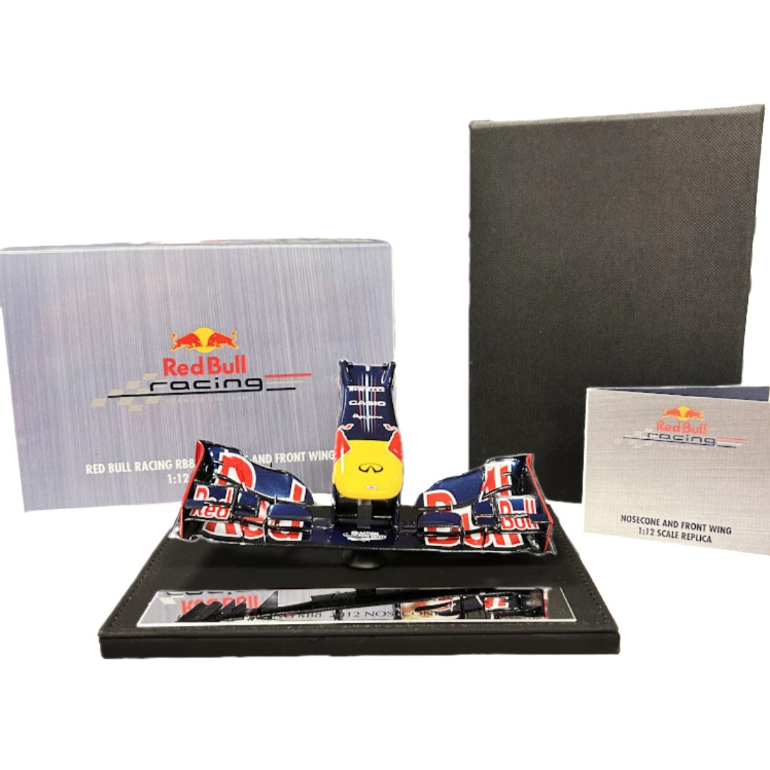 Este nosecone (parte frontal do carro) em escala 1/12 é apresentado em uma base de exibição refinada, acompanhado de placa descritiva e certificado de autenticidade, tornando-se uma peça exclusiva e de destaque para qualquer coleção. Um tributo à velocidade, à inovação e à superioridade técnica da Red Bull Racing.
